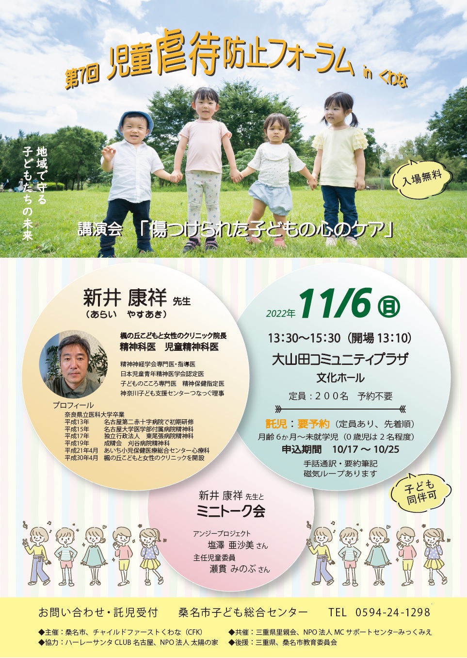 このフォーラムは、毎年11月の「児童虐待防止推進月間」に、チャイルドファーストくわな(CFK)と桑名市の主催で開催されています。