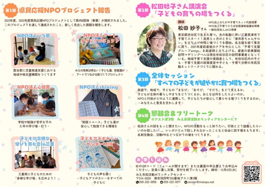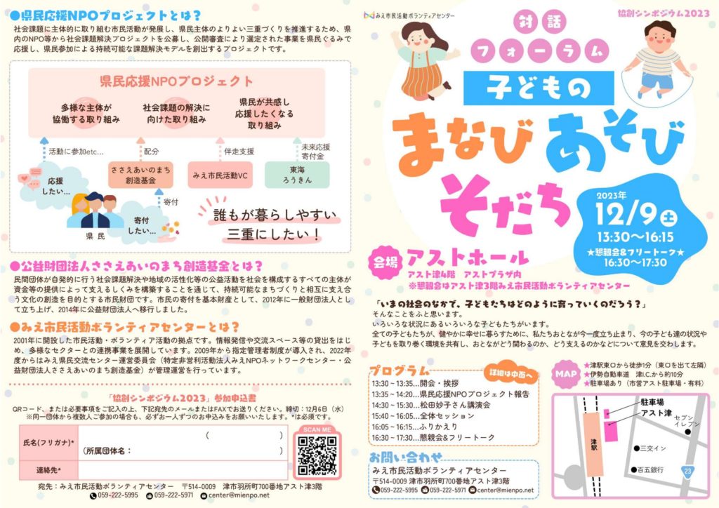 ホーム « イベント一覧 このイベントは終了しました。 協創シンポジウム2023 「対話フォーラム こどもの『まなび』『あそび』『そだち』」@津 12月 9, 2023 @ 1:30 PM - 4:00 PM « 子ども食堂勉強会 @四日市 NPO法人 あったかコミュRみえ 活動10周年記念式典 @四日市 » 公式サイトへこちらです。 https://www.mienpo.net/news/kyousou2023/ カレンダーに追加 Google カレンダー iCalendar Outlook 365 Outlook Live 詳細 日付: 12月 9, 2023 時間: 1:30 PM - 4:00 PM 会場 アストホール 津市羽所町700番地 + Google マップ